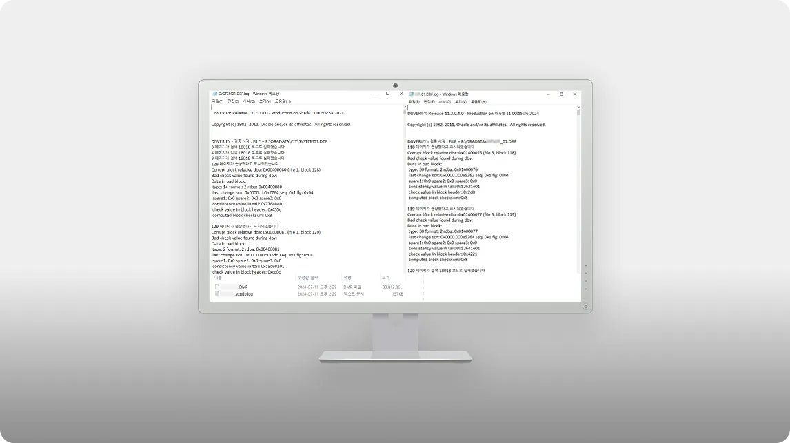 복구천사는 서버 및 스토리지 상태를 먼저 정밀 분석한 뒤, 파일 단위로 안전한 복구를 수행하고 Oracle DB 구조에 맞춘 정확한 진단을 병행합니다.
